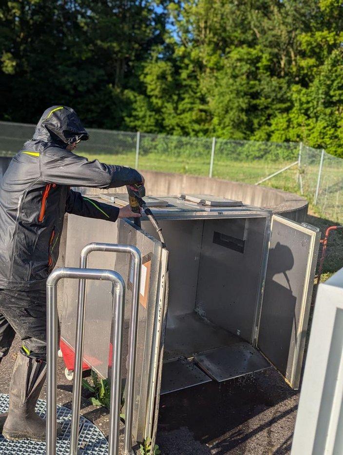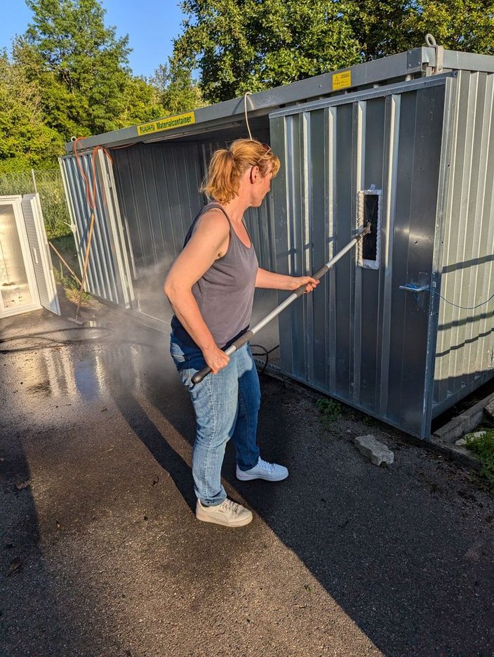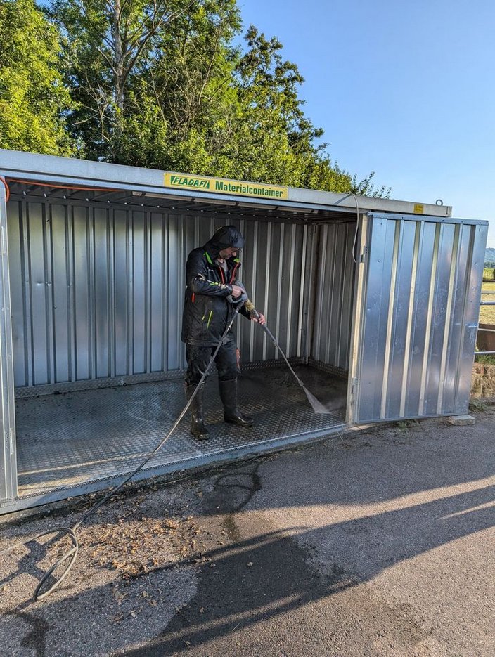 Bei uns war eine Reinigung der Wildverwahrstelle angezeigt. Dank freiwilliger Helfer und des Heißdampfstrahlers eines befreundetes Landwirtes konnte es losgehen. Alle Behältnisse wurden aus dem Container entfernt, diese und der Container selber gereinigt und die Behältnisse, bis auf die zu ersetzende Kühleinheit, zurück verbracht.