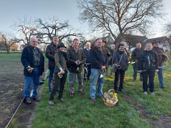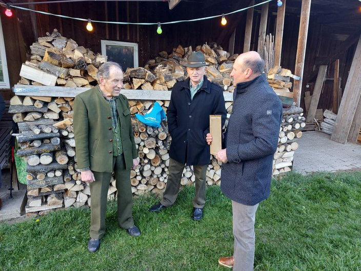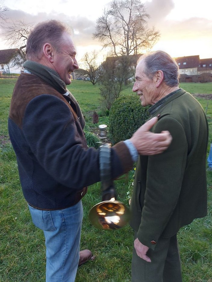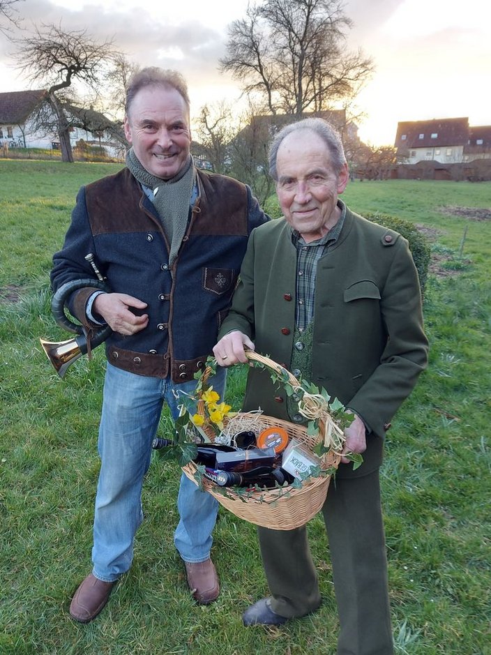Unserem Jubilar Heinz Gärtling gratulierten zum 85. Geburtstag der Hegeringleiter Martin Mayer, unser Ehrenkreisjägermeister Hubert Kiesel und die Jagdhornbläser der Jägervereinigung Schwäbisch Hall.