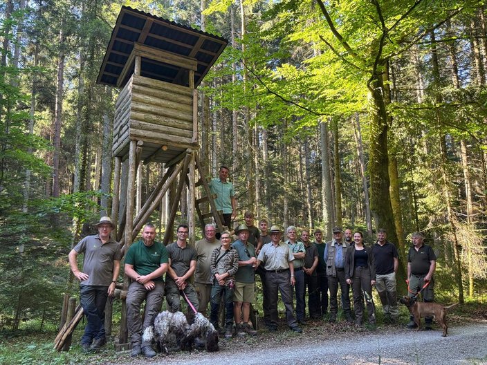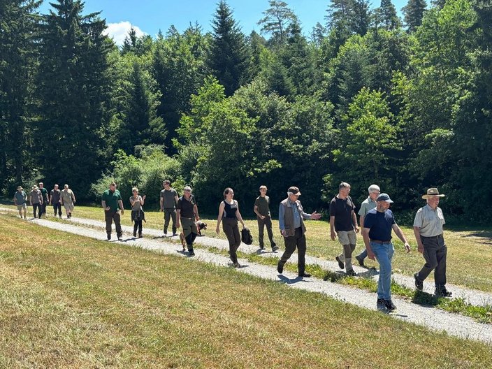 Zahlreiche interessierte Jägerinnen und Jäger folgten am 29. Juni der Einladung von Ehrenkreisjägermeister Hubert Kiesel zu einem Waldbegang im Großen Wald auf Gemarkung Bühlerzell.